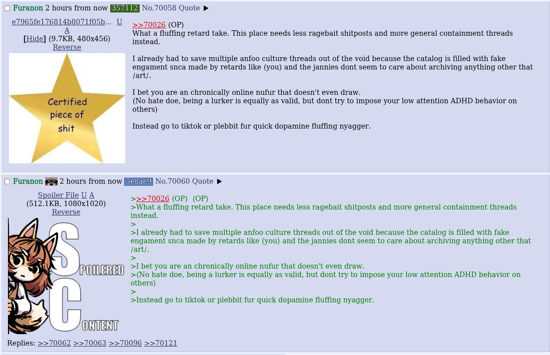 >>70096 In the time it took me to type that post, ~6 threads where created (it took ~30 mins). I dont even want to do the maths but thats 1 thread each 5 minutes and sounds absurd fur a place that intends to create a healthy community. But whatever. Also I was trying to save the "Terrible Mouse" and the "post your drawings" threads but it seems that they no longer exist. Keep the incredible work of doing nothing jannies. 😒 >70121 It no longer surprises me that this nyagger hasn't been banned yet, cause it seems that the jannies are sleepingmaxxing. Although its amusing to see that there's someone out there that keeps approving his images and then spoiling them minutes later. Like, what are you doing with your life lil bro? 🥀 This place will continue devolving if you guys keep giving your attention to low effurt ragebait like >70060. But whatever, let's see if this place implodes in two more weeks or nothing ever happens. On unrelated news. I will take some days offline to avoid having a crashout o algo. Goodbye.