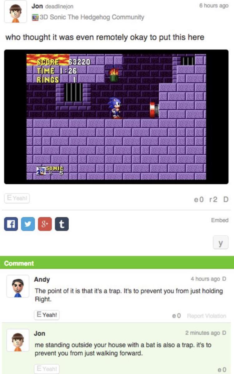 >Sonic fans when they actually have to play the games instead of playing with the characters like dolls.