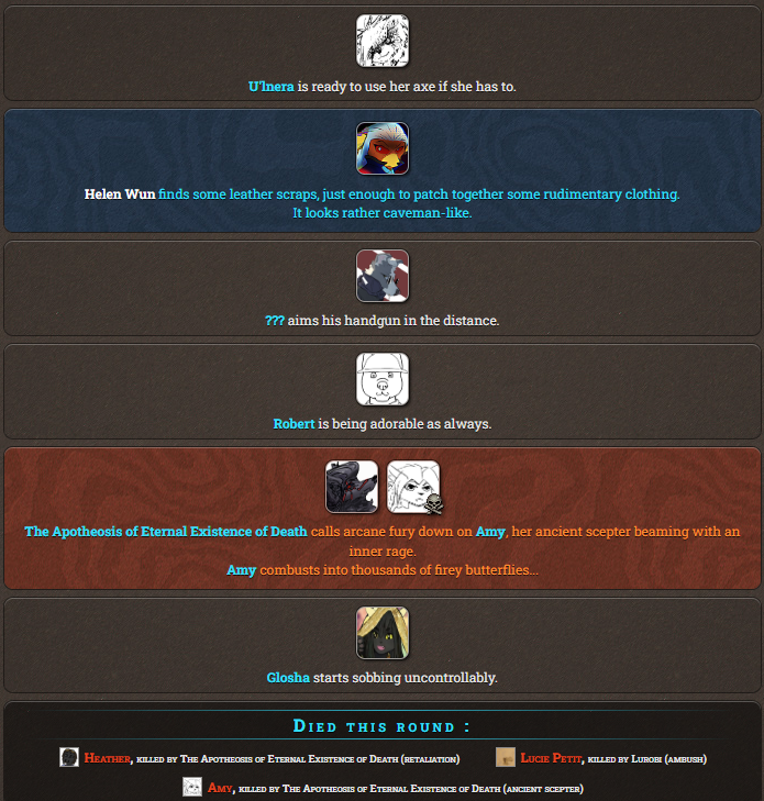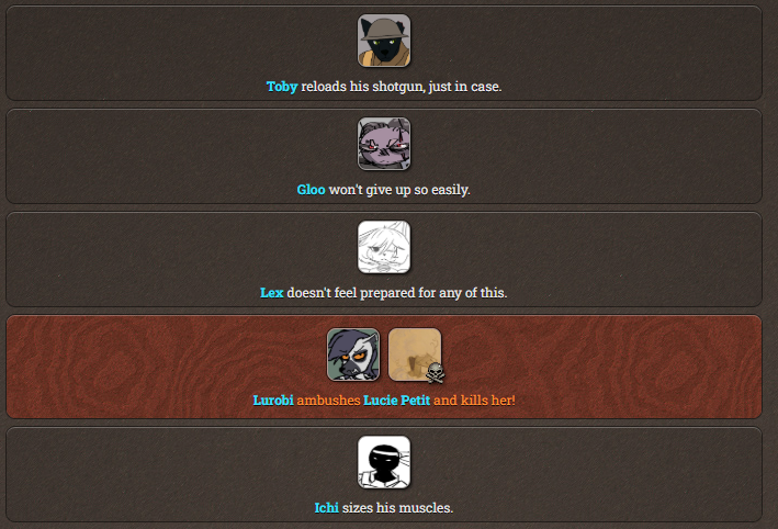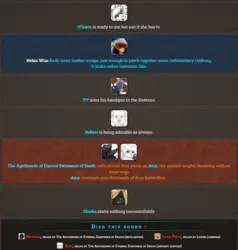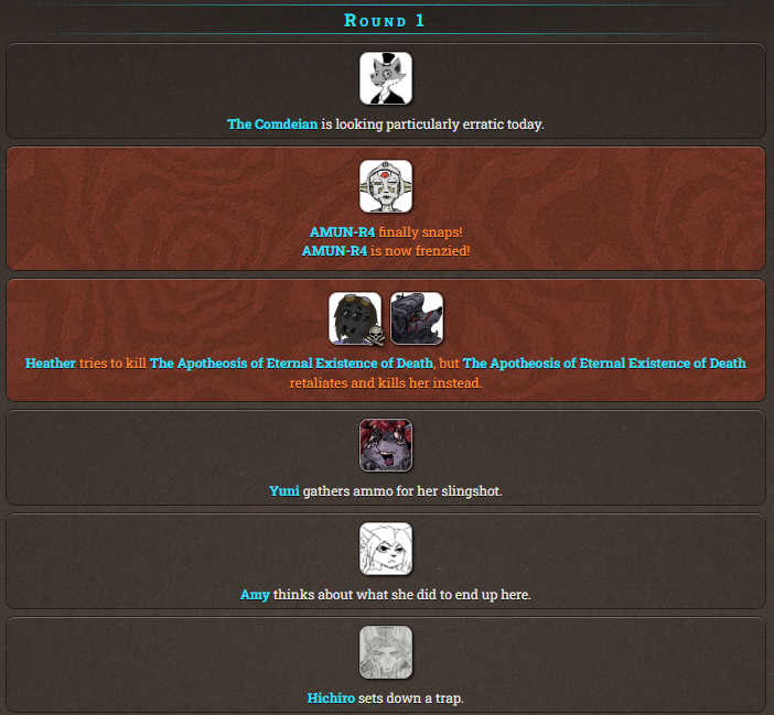 What do we think of this one? I think having perks is kind of interesting so it isn't entirely just rng, but I feel like the normal hunger games simulator has some more interesting events and down time interactions
