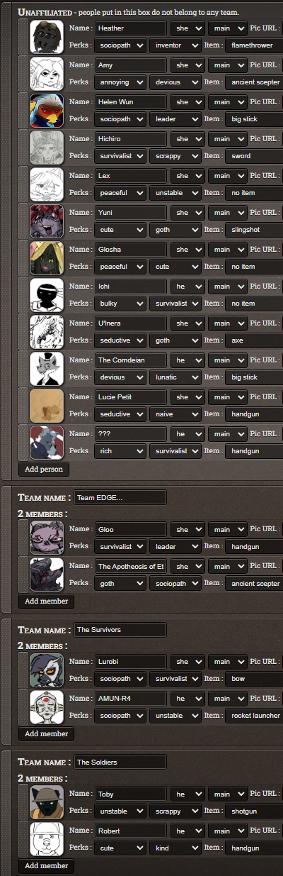 Take a look at it and make sure to specify which two perks and item your character gets or else I will make it whatever. You can also choose fur your character to be part of a team, only two per team though. Going solo is also an option if you prefer.