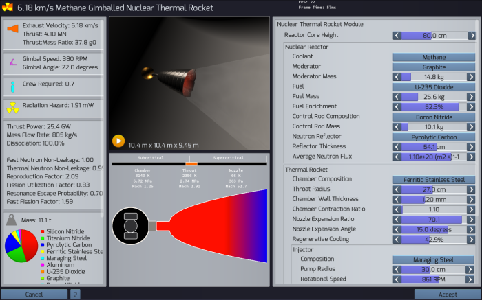 For the curious. The tl;dr is, imagine a large-ish, on the order of tens of meters in diameter, hollow incomplete sphere lined with a heat-resistant material that reflects neutrons, like maybe tungsten carbide. The sphere is the reaction chamber. One side of it, which we'll call the bottom, has a rocket nozzle sticking out of it. The other, which we'll call the top, has tubes going in that bring in a liquid fuel. This isn't just any rocket fuel. It's soluble uranium salts, like maybe uranium tetrabromide, dissolved in water, with a high level of fissile isotopes like U235 or maybe U233. The concentration of dissolved uranium and the volume and shape of the reaction chamber are designed very carefully so that you get a chain reaction when the chamber is not quite full of fuel; fuel tanks are long and skinny so that a critical mass doesn't form until the fuel is in the reactor. Anyway, when sufficient fuel is in the reactor, a chain reaction takes place. In a millisecond the water mixture flashes over to steam, then plasma, and squirts through the nozzle as a roostertail of radioactive fire going that-a-way at, if you believe Zubrin's back-of-the-envelope calculations, around fifty kilometers a second. That's-a spicy-a meatball! Specific impulse, the number that the rocket scientists call Iₛₚ, is yuge for this system and makes any and all chemical rocket fuels, even the weird exotic ones that use crazy dangerous stuff like chlorine trifluoride as the oxidizer, look pointless.